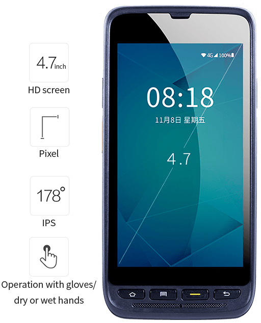 Экран диагональю 4,7 дюйма с HD разрешением гарантирует яркое и отчетливое отображение информации при любом освещении, включая яркий солнечный свет при работе на открытом воздухе. Промышленный емкостной тип дисплея позволяет работать с терминалом как в перчатках, так и без, а также при наличии влаги на экране (или мокрыми пальцами).